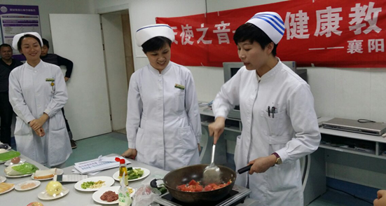此次活动由内分泌科护士长唐明珠主持,护理部吴瑞勤副主任亲自指导,该科张衡老师准备了新鲜食材,现场为糖尿病患者及家属上了一堂生动、形象的课,并让患者亲自搭配食谱,护理部吴主任现场演示了如何做一道既健康又可口饭菜。